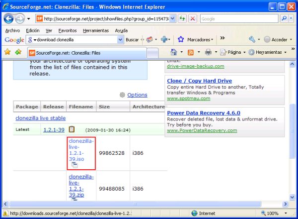 Como resultado de la acción anterior, se nos presentará la siguiente ventana, en la cual haremos clic sobre el enlace "clonezilla-live-1.2.1.39.iso", tal y como vemos en la imagen inferior, para proceder a descargar la imagen ISO del software de clonación CloneZilla.