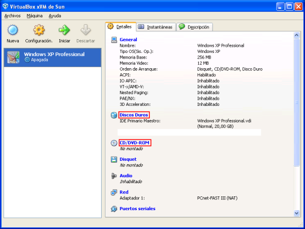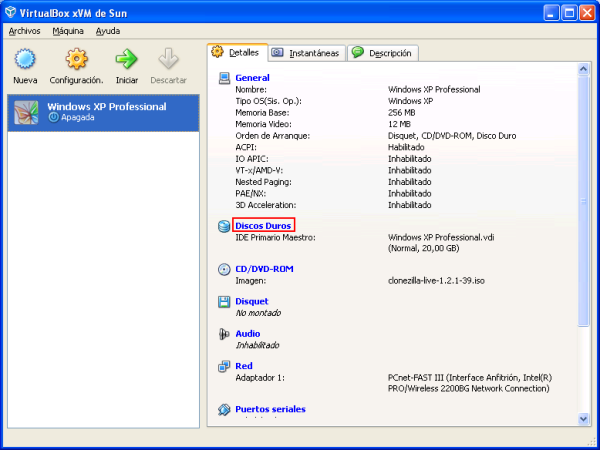 Una vez que haya sido apagada la máquina virtual "Windows XP Professional", procederemos a quitar de la misma el segundo disco duro virtual "DiscoImagen.vdi" y la imagen ISO de CloneZilla, de modo que cuando dicha máquina virtual presente el aspecto mostrado en la ventana de la imagen inferior, podremos dar por concluido este apartado.