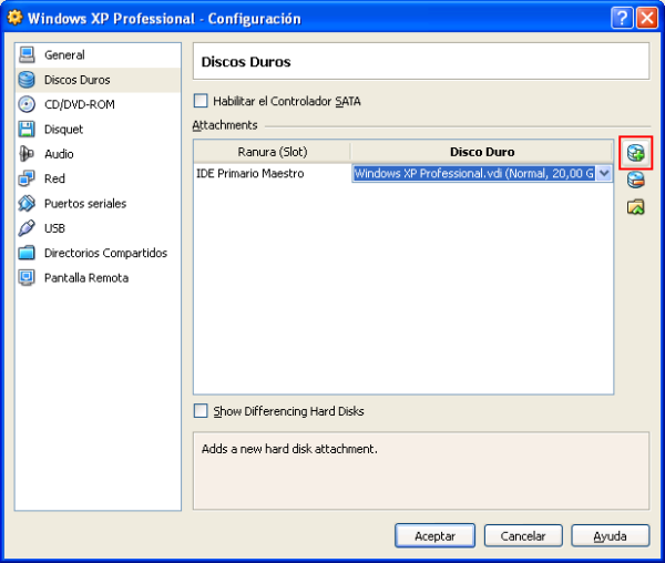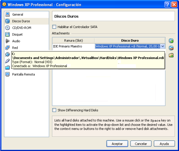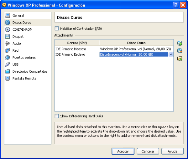 En ese instante pasa a ser creado un segundo disco duro "DiscoImagen.vdi" asociado a la ranura "IDE Primario Esclavo", de modo que finalmente el disco duro "Windows XP Professional.vdi" quede asociado a la ranura "IDE Primario Maestro", y el disco "DiscoImagen.vdi" quede asociado a la ranura "IDE Primario Esclavo", momento en el que pulsaremos sobre el botón "Aceptar" en la ventana de la imagen inferior.