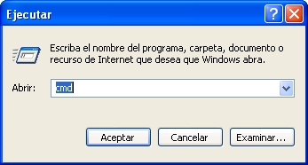 A continuación desde nuestro equipo anfitrión lanzaremos una ventana de DOS, lanzando "Inicio -> Ejecutar" y tecleando a continuación el comando "cmd", tal y como vemos en la ventana de la imagen inferior.