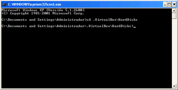 En la nueva ventana mostrada teclearemos el comando "cd .VirtualBox\HardDisk", para ubicarnos sobre la ruta donde se encuentra almacenado el disco duro de nuestro equipo, y tras ello pulsaremos sobre la tecla "Enter".