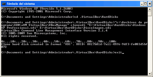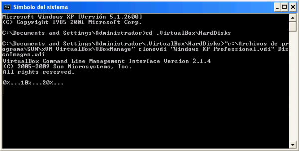 NOTA: Hemos de notar que el comando anterior hemos de teclear entre comillas la ruta al comando de duplicación del disco duro ("c:\Archivos de programa\SUN\xVM VirtualBox\VBoxManage"), así como el nombre del disco duro virtual de origen ("Windows XP Professional.vdi"), es decir, las comillas correspondientes deberán ser incluidas en el comando anterior para su correcto funcionamiento.