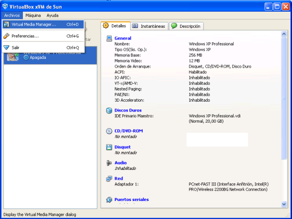 Para añadir el nuevo disco duro virtual "DiscoImagen.vdi" creado con anterioridad al equipo "Windows XP Professional", en primer lugar deberá ser reconocido por VirtualBox, luego en primer lugar en la ventana principal de VirtualBox haremos clic sobre la opción "Archivos" del menú principal, y posteriormente elegiremos "Virtual Media Manager" en el desplegable correspondiente.