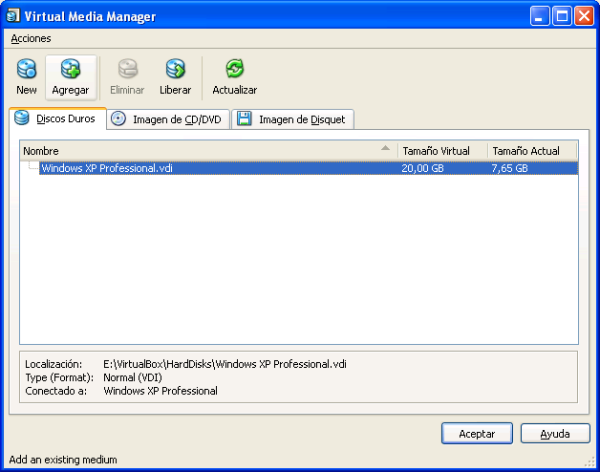 En la nueva ventana mostrada como resultado de la acción anterior, nos situaremos sobre el disco duro virtual "Windows XP Professional.vdi", tal y como vemos en la ventana de la imagen inferior, pasando a ser mostrado en ese instante un mensaje que nos indica la ruta de nuestro equipo anfitrión donde se encuentra almacenado el disco duro de la máquina virtual "Windows XP Professional", en nuestro caso "C:\Documents and Settings\Administrador\.VirtualBox\HardDisks\Windows XP Professional.vdi".