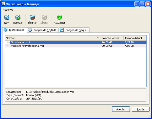Tras completar la acción anterior, podremos comprobar como VirtualBox ya dispone de un segundo disco duro virtual "DiscoImagen.vdi" que podrá ser utilizado por las máquinas virtuales correspondientes, en nuestro caso lo utilizaremos para almacenar la imagen del equipo "Windows XP Professional"; en la ventana de la imagen inferior pulsaremos sobre el botón "Aceptar" para proceder a su cierre.