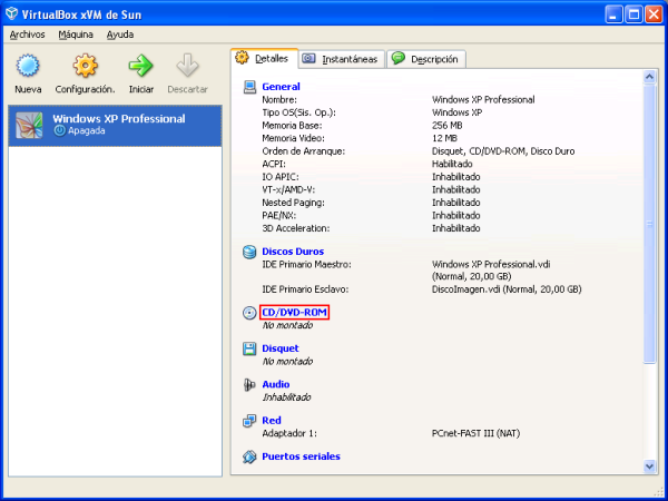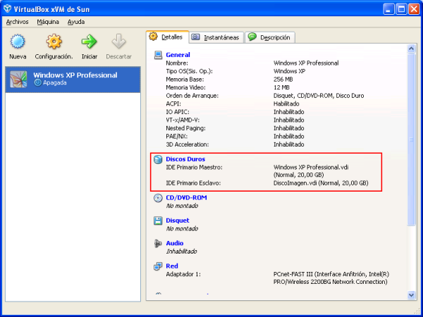 De vuelta a la ventana principal de VirtualBox, podremos comprobar como la instalación del segundo disco duro virtual "DiscoImagen.vdi" ha sido realizada correctamente en la máquina virtual "Windows XP Professional".