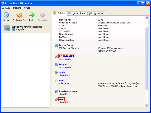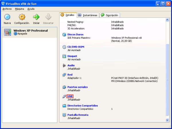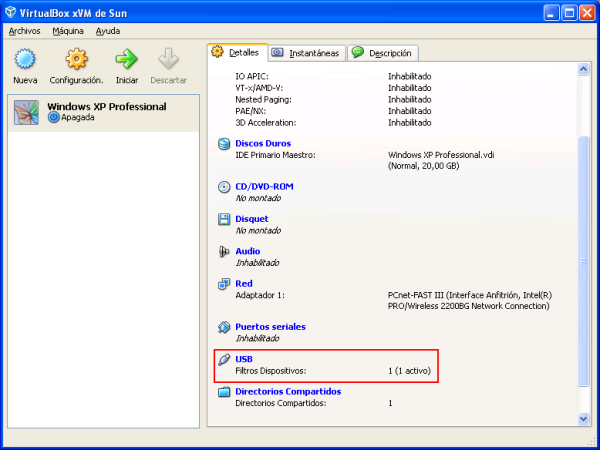 De vuelta a la ventana principal de VirtualBox, podremos comprobar como en la máquina virtual "Windows XP Professional" ya se dispone de un dispositivo USB configurado y activo, concretamente nuestro disco USB externo.