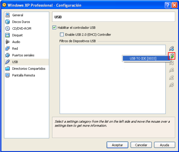 En la ventana mostrada como resultado de la acción anterior, activaremos la casilla "Habilitar el controlador USB", y tras ello pulsaremos sobre el icono de agregación de un dispositivo USB, para seleccionar a continuación el soporte correspondiente, en nuestro caso "USB TO IDE [0033]", tal y como vemos en la ventana de la imagen inferior.