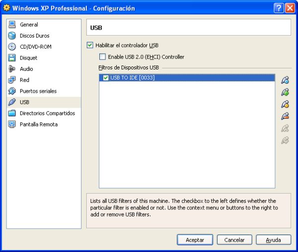 Una vez completada la acción anterior, el nuevo soporte USB queda correctamente reconocido por VirtualBox, pudiendo hacer uso del mismo desde la máquina virtual a partir de este instante, de modo que cuando la ventana de configuración de los dispositivos USB presente el siguiente aspecto, pulsaremos en ella sobre el botón "Aceptar".