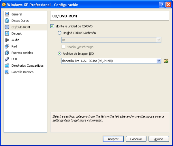Llegados a este punto ya dispondremos de un soporte donde poder almacenar la imagen del equipo con sistema operativo Windows XP Professional que hemos estado preparando a lo largo de la documentación, bien sea el disco duro virtual que hayamos definido, o bien nuestro soporte USB externo, y para dar comienzo a dicho proceso en primer lugar deberemos introducir el CD de "CloneZilla" en la unidad correspondiente de dicho equipo, o a abrir la imagen ISO del mismo si estamos utilizando máquinas virtuales, tal y como es nuestro caso, para lo cual en primer lugar pulsaremos sobre el enlace "CD/DVD-ROM" del equipo "Windows XP Professional".