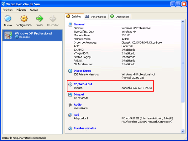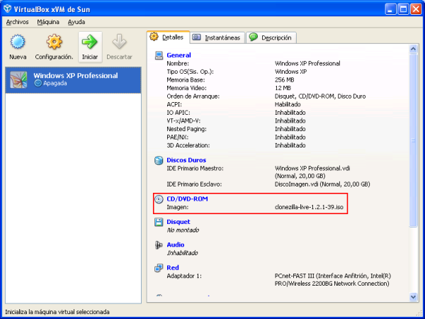 De vuelta a la ventana principal de VirtualBox, podremos comprobar como la imagen ISO de CloneZilla ya se encuentra cargada en la máquina virtual "Windows XP Professional", momento en el que pulsaremos sobre el botón "Iniciar" para arrancar dicha máquina virtual.