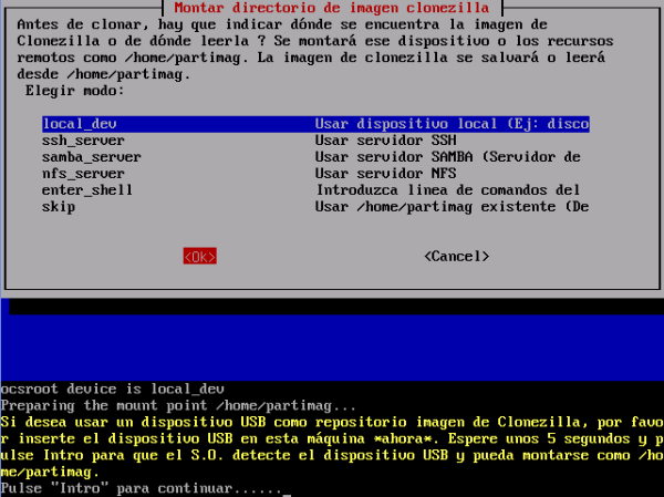 El siguiente parámetro a seleccionar es el lugar desde el cual descargaremos la imagen, seleccionando en nuestro caso la primera opción "local_dev Usar dispositivo local..." para indicar que utilizaremos un dispositivo local al equipo (en nuestro caso un disco duro), y pulsando tras ello sobre la tecla "Enter".