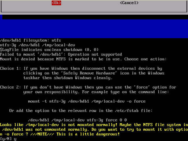 Dado que estamos utilizando para almacenar la imagen un disco duro virtual que CloneZilla reconoce como un disco duro con formato NTFS en uso, la aplicación nos pide confirmación de que dicho disco NTFS es el que realmente deseamos utilizar para almacenar la imagen, pregunta a la que responderemos afirmativamente pulsando sobre la tecla "y", y posteriormente sobre la tecla "Enter".