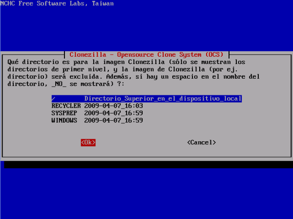 A continuación el asistente nos permitirá seleccionar el directorio donde será almacenada la imagen que vamos a crear, seleccionando en nuestro caso la opción ofertada por defecto "/ Directorio_Superior_en_el_dispositivo_local", y pulsando posteriormente sobre la tecla "Enter".