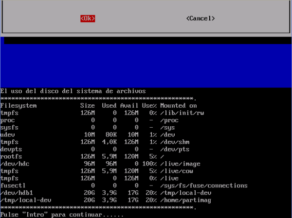 Si hemos introducido correctamente las credenciales del usuario "administrador", pasará a ser mostrada la siguiente ventana, en la que se nos mostrarán, a título informativo, las diversas unidades actuales del sistema de ficheros, luego pulsaremos en ella directamente sobre la tecla "Enter".