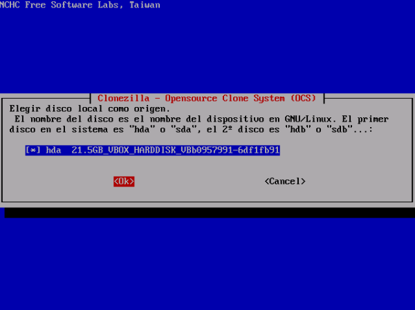 Tras ello deberemos seleccionar el disco a partir de cual será creada la imagen en cuestión, seleccionando en nuestro caso el disco "hda1", la única opción disponible, correspondiente a la primera partición del disco primario, en la cual se encuentra instalado el sistema operativo y las aplicaciones que hemos ido instalando con anterioridad para crear la imagen.