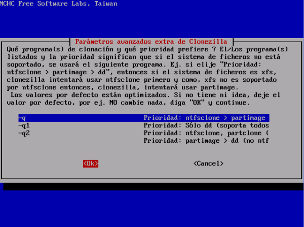 A partir de este instante, el asistente de creación de imagen de CloneZilla, nos solicitara parámetros relacionados con las configuraciones de clonación deseadas; en la ventana de la imagen inferior podremos especificar el programa de clonación y su prioridad, dejando en nuestro caso seleccionada la opción "-q" que por defecto nos ofrecerá el asistente, para pulsar en ella directamente sobre la tecla "Enter".