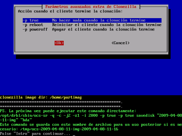 El último parámetro solicitado por CloneZilla es como deberá comportarse la aplicación una vez que concluya la creación de la imagen, dejando de nuevo seleccionada la opción "-p true" propuesta por defecto por el asistente, para que la aplicación no haga nada tras concluir el proceso de creación de la imagen.