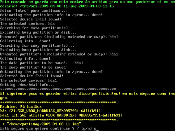 Antes de dar comienzo de modo efectivo al proceso de creación de la imagen, CloneZilla nos pide confirmación a través de la siguiente ventana, en la cual se nos preguntará si deseamos continuar con el proceso de creación de la imagen, respondiendo afirmativamente al pulsar sobre la tecla "y", y posteriormente sobre la tecla "Enter".
