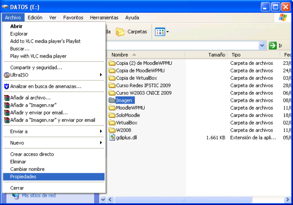En primer lugar en el equipo deseado crearemos una carpeta de nombre "Imagen", donde almacenaremos la imagen del equipo "Windows XP Professional", y tras ello situados sobre dicha carpeta, seleccionaremos la opción "Archivo" en el menú principal de la ventana de la imagen inferior, para posteriormente seleccionar "Propiedades" en el desplegable correspondiente.