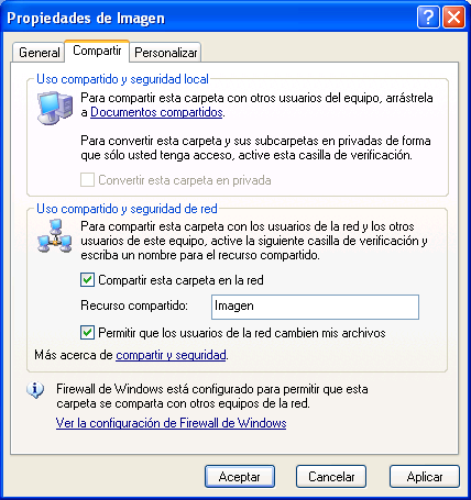 Como resultado de la acción anterior pasará a ser mostrada la siguiente ventana, en la cual activaremos la casilla "Compartir esta carpeta en la red", y tras ello teclearemos la cadena de texto "Imagen" en la caja de texto correspondiente como nombre del recurso que vamos a compartir, para posteriormente activar la casilla "Permitir que los usuarios de la red cambien mis archivos", tal y como vemos en la ventana de la imagen inferior, para finalmente pulsar sobre el botón "Aceptar".