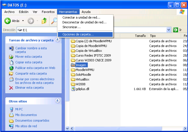 Con la configuración realizada en la ventana de la imagen anterior, cualquier usuario podría grabar en la carpeta compartida "Imagen", lo cual provoca un problema de seguridad, luego para afinar los permisos de acceso a la carpeta compartida "Imagen", en primer lugar haremos clic en el menú principal de la ventana correspondiente sobre la opción "Herramientas", para posteriormente seleccionar "Opciones de carpeta" en el desplegable asociado a dicha opción.