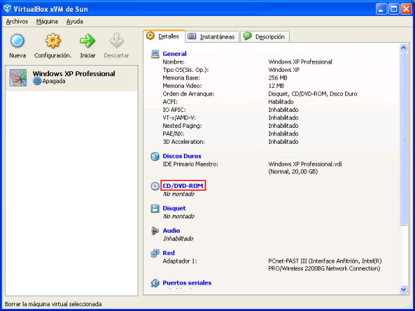 Una vez que haya sido apagada la máquina virtual "Windows XP Professional", procederemos a quitar de la misma la imagen ISO de CloneZilla, de modo que cuando dicha máquina virtual presente el aspecto mostrado en la ventana de la imagen inferior, podremos dar por concluido este apartado.