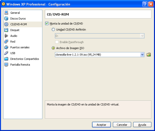Como resultado de la acción anterior, pasará a ser mostrada la siguiente ventana, en la que activaremos la casilla "Monta la unidad de CD/DVD", y tras ello seleccionaremos el radio botón "Archivo de Imagen ISO", para elegir el fichero de imagen ISO del CD-Live de CloneZilla, tal y como vemos en la ventana de la imagen inferior, tras lo cual pulsaremos sobre el botón "Aceptar".
