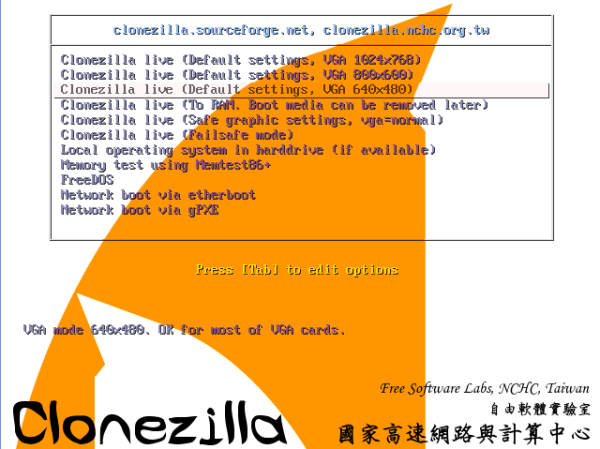 Como resultado de la acción anterior, pasará a ser ejecutado el CD-Live de CloneZilla, en cuya primera ventana seleccionaremos la opción "Clonezilla live (Default settings, VGA 640x480)", tras lo cual pulsaremos sobre la tecla "Enter".