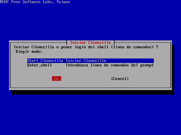 En la siguiente ventana de CloneZilla, podremos elegir entre trabajar con el entorno propio de la aplicación, o bien hacerlo mediante línea de comandos, seleccionando en nuestro caso la primera opción al elegir "Start_Clonezilla Iniciar Clonezilla" en la ventana de la imagen inferior, para pulsar posteriormente sobre la tecla "Enter".