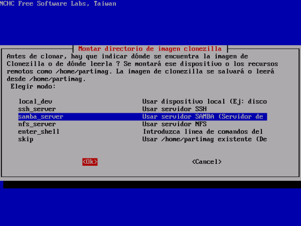 El siguiente parámetro a seleccionar es el lugar donde será almacenada la imagen, seleccionando en nuestro caso la opción "samba_server Usar servidor SAMBA..." para indicar que utilizaremos un servidor SAMBA para almacenar la imagen, y pulsando tras ello sobre la tecla "Enter".