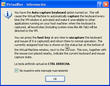 Si estamos utilizando la aplicación "VirtualBox" por primera vez, se nos mostrará la siguiente ventana, que básicamente nos indica que cuando hagamos clic con el ratón sobre la máquina virtual, ésta tomará el control del teclado y del ratón, y cuando pulsemos en nuestro teclado sobre la tecla "CRTL" situada a la derecha del espaciador, el teclado y el ratón pasarán a estar disponibles en la máquina anfitriona; en dicha ventana activaremos la casilla "No muestre este mensaje nuevamente", y tras ello pulsaremos en ella sobre el botón "OK".