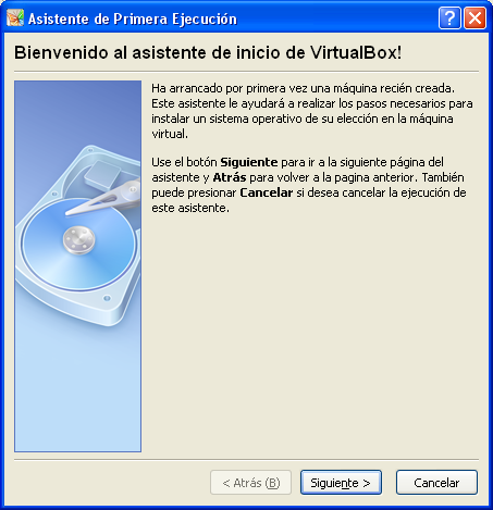 A continuación, se nos presentará la siguiente ventana, de bienvenida a un asistente de inicio de "VirtualBox" que se lanza la primera vez que se ejecuta una máquina virtual con dicha aplicación, y en la que pulsaremos directamente sobre el botón "Siguiente".