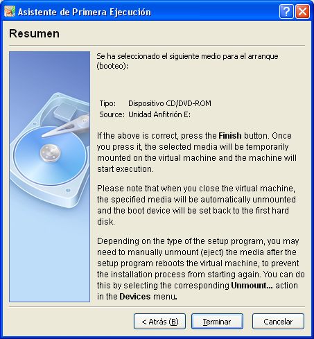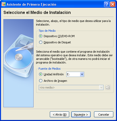 Tras ello dicho asistente de primera ejecución nos indicará que seleccionemos el dispositivo desde el cual vamos a instalar el sistema operativo deseado, en nuestro caso seleccionaremos el radio botón "Dispositivo CD/DVD-ROM" en el apartado "Tipo de Medio", y posteriormente seleccionaremos la unidad correspondiente, "E:" en nuestro caso, en el desplegable "Unidad Anfitrión", tal y como vemos en la ventana de la siguiente imagen.