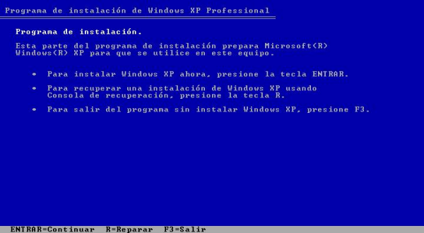 El proceso de instalación continúa con normalidad hasta que se detiene en el momento en que el sistema nos pregunta sobre la acción que deseamos realizar a partir del CD introducido; en nuestro caso pulsaremos sobre la tecla "Enter" para comenzar la instalación del sistema operativo Windows XP Professional en el equipo correspondiente.