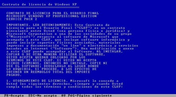 En la siguiente ventana mostrada por el asistente deberemos pulsar sobre la tecla "F8" para aceptar el contrato de licencia, y poder así continuar con el proceso de instalación con normalidad.