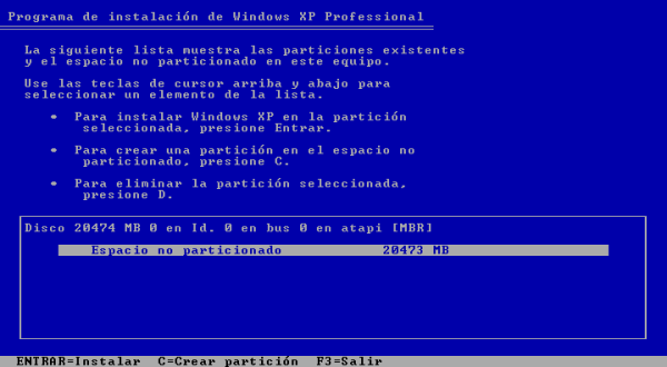 En nuestro caso sólo haremos una única partición de 20 Gb, luego nos ubicaremos sobre el apartado "Espacio no particionado", para pulsar a continuación sobre la tecla "Enter".