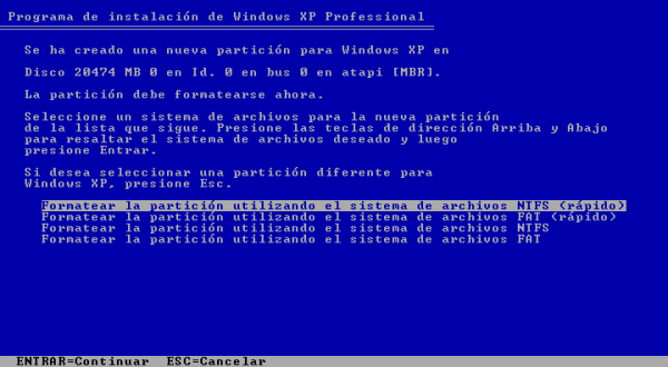 NOTA: Es MUY IMPORTANTE que el sistema de ficheros seleccionado sea NTFS, y no FAT, pues NTFS permite asociar permisos a los usuarios del sistema para el acceso a los recursos, programas, etc., del mismo, opción ésta que no es posible habilitar con el sistema de ficheros FAT.