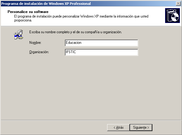 A continuación deberemos rellenar las cajas de texto correspondientes al "Nombre" y a la "Organización" con los valores oportunos; en nuestro caso hemos especificado los valores "Educacion" e "IFSTIC" respectivamente, y posteriormente hemos pulsado sobre el botón "Siguiente".