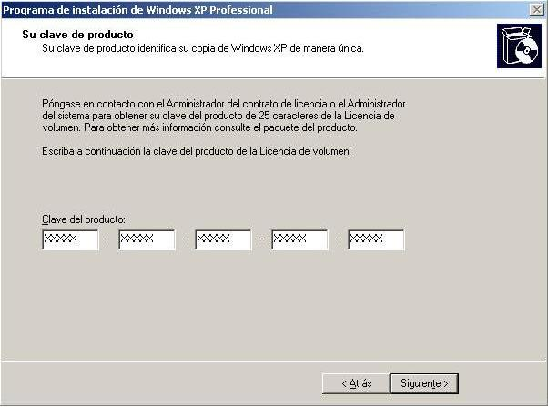 El siguiente paso consistirá en introducir la clave del producto que estamos instalando; proporcionaremos la clave propia del CD de "Windows XP Professional" con el cual estamos llevando a cabo el proceso de instalación, y tras ello pulsaremos sobre el botón "Siguiente".