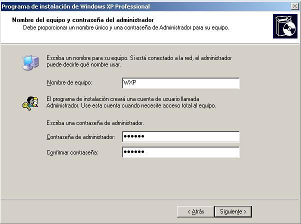 En la siguiente ventana deberemos especificar el nombre que va a tener este equipo, así como la clave que será asociada al usuario "Administrador" local de dicho equipo; hemos procedido indicando como nombre para este equipo "WXP", y a continuación hemos definido la clave deseada para el usuario "Administrador", tal y como vemos en la imagen inferior, para pulsar finalmente sobre el botón "Siguiente".