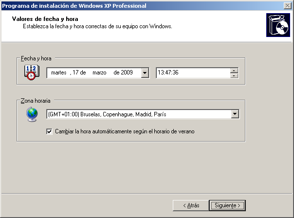 La siguiente ventana nos permitirá ajustar la fecha, la hora y la zona horaria, así como cambiar automáticamente la hora del equipo según el horario de verano; confirmaremos que dichos parámetros son correctos, y posteriormente pulsaremos sobre el botón "Siguiente".