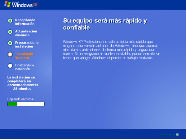 Tras ello da comienzo el formateo de la partición especificada, y tras completarse dicho formateo comienza la copia de los ficheros necesarios para instalar Windows XP Professional en nuestro equipo, tal y como se muestra en la siguiente imagen.