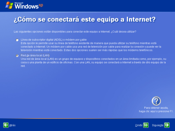 El siguiente elemento a configurar es el modo en el que nuestro ordenador se conectará a Internet; en nuestro caso activaremos el radio botón "Red de área local (LAN)", y posteriormente pulsaremos sobre el botón "Siguiente".