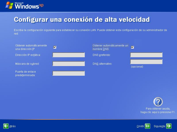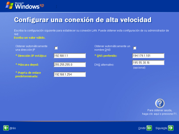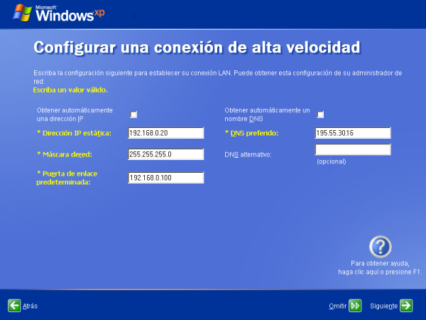 Dado que en nuestro caso asumiremos que NO disponemos de un servidor DHCP en nuestra red, deberemos especificar manualmente el direccionamiento IP oportuno para que el equipo que estamos configurando pueda navegar por Internet, indicando en la caja de texto "Dirección IP estática", "Máscara de red", "Puerta de enlace predeterminada" y "DNS preferido", los valores oportunos que nos permitan navegar en el entorno en el que estemos instalando este equipo.