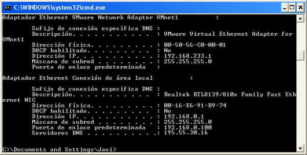 Podemos observar como respecto a los datos de direccionamiento IP mostrados en la ventana de DOS anterior, hemos variado la dirección IP del equipo, asociando como dirección IP "192.168.0.20", es decir una dirección IP del mismo rango en el cual está el equipo de la red analizado, pero que NO esté siendo ocupada en este instante por ningún otro dispositivo en dicha red (NO tendría porqué ser "192.168.0.20", podría haber sido cualquier otro direccionamiento IP del mismo rango que estuviera libre, por ejemplo "192.168.0.45" o "192.168.0.73", por poner dos ejemplos cualquiera); el resto de valores que hemos de indicar en los parámetros "Máscara de red", "Puerta de enlace predeterminada", y "Servidor DNS", serían los mismos que nos muestra la ventana de DOS anterior.
