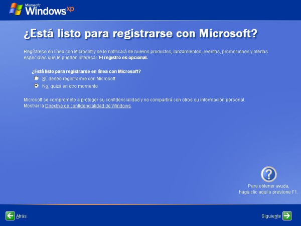 A continuación el sistema nos brindará la posibilidad de registrarnos con Microsoft a través de Internet si así lo deseamos; en nuestro caso seleccionaremos el radio botón "No, quizá en otro momento", y posteriormente pulsaremos sobre el botón "Siguiente".