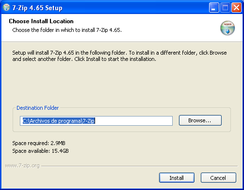 Así pues autenticados en nuestro equipo cliente Windows XP Professional con las credenciales del usuario "Profesor", procederemos a copiar el fichero de instalación "7z465.exe" de "7-Zip 4.65" en el Escritorio de dicho equipo, para posteriormente hacer doble clic sobre el mismo, pasando a ser mostrada la primera ventana del asistente de instalación, en la cual podríamos modificar la ruta de instalación de la aplicación en cuestión, si bien en nuestro caso la daremos por valida pulsando directamente en dicha ventana sobre el botón "Install".