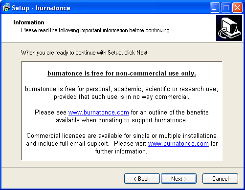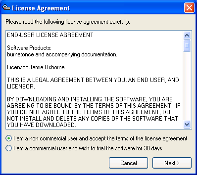 Llegados a este punto ya podremos lanzar la aplicación "BurnAtOnce", haciendo doble clic sobre el acceso directo "burnatonce" existente en el Escritorio de nuestro equipo Windows XP Professional, pasando en primer lugar a ser mostrada la siguiente ventana como resultado de dicha acción; en ella seleccionaremos el radio botón "I am a non commercial user and accept the terms of the license agreement" para indicar que no vamos a hacer un uso comercial de esta aplicación, y posteriormente pulsaremos sobre el botón "Next >".