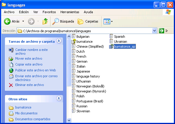 Una vez completados los procesos de instalación y actualzación de "BurnAtOnce", procederemos a copiar el fichero de ayuda en español "burnatonce_sp.chm", a la ruta "C:\Archivos de programa\burnatonce\languages" de nuestro equipo Windows XP Professional, tal y como vemos en la imagen inferior.